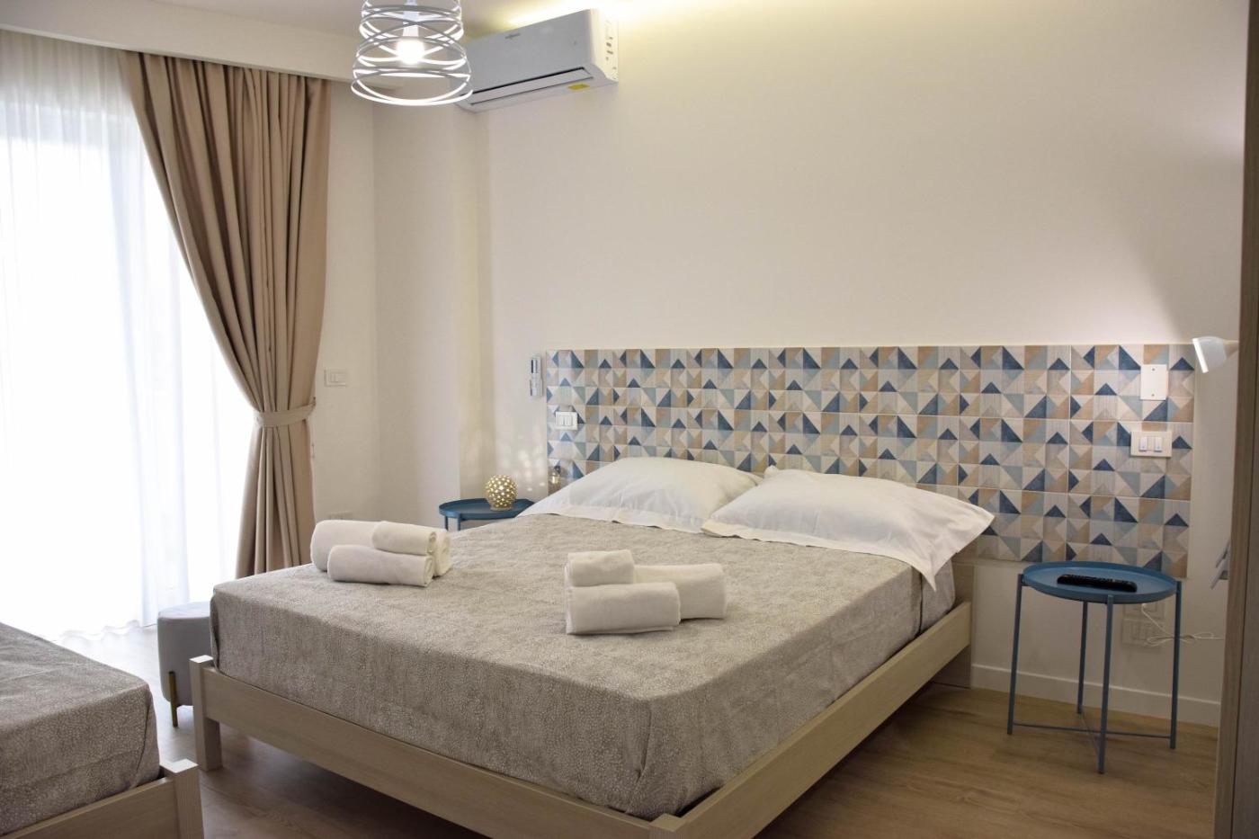 Camera Deluxe MatrimonialeDoppia con Letti Singoli con Balcone. Spaziosa camera matrimoniale dotata di aria condizionata, pareti insonorizzate, balcone con vista mare e bagno privato con doccia a filo pavimento. ;