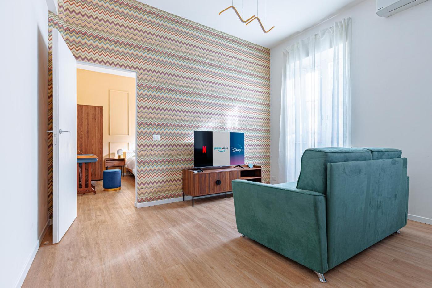 Appartamento Deluxe con 1 Camera da Letto. This air-conditioned apartment includes 1 living room, 1 separate bedroom and 1 bathroom with a shower. In the well-equipped kitchen, guests will find a stovetop, a refrigerator, kitchenware and a microwave. The apartment offers a flat-screen TV with streaming services, a coffee machine, a dining area, a wardrobe as well as garden views. The unit has 3 beds.